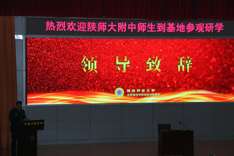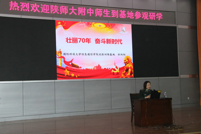 9时许,大巴车抵达了本次研学活动的第一处目的地——国防科技大学信息通信学院试验训练基地,该基地是我校的双拥共建单位,已与我校于2019年10月9日举行了双拥共建单位授牌仪式并签署协议。在基地的学术报告厅,举行了本次共建活动简短的开幕式,基地副主任王飞致欢迎词,信息通信训练系杜柯柯讲师带领我们回溯了新中国成立以来砥砺奋进的历程。七十年不忘初心,七十年风雨共济,从站起来、富起来到强起来,中国人所创造的奇迹般的成就,使我们惊叹,更使我们为之震撼。最后,杜老师引用了习近平总书记的话表达对学生们的期望——“青年一代有理想,有担当,国家就有前途,民族就有希望!” 杜老师的生动讲述,赢得了同学们一阵阵热烈的掌声。