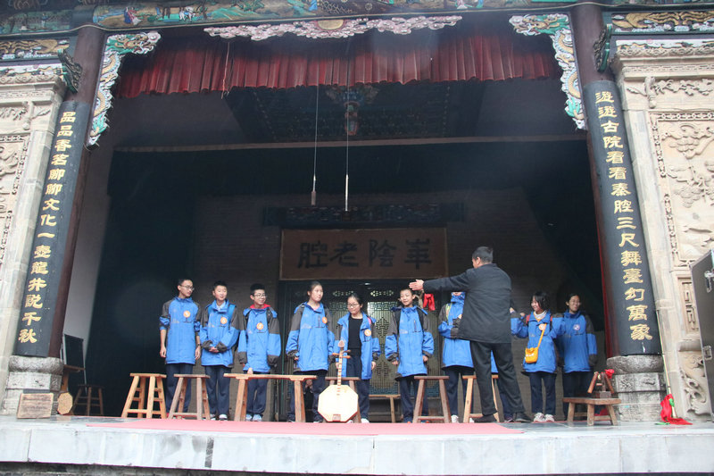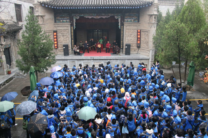 该博物院是由王勇超先生历经30余年,耗资5.7亿建成,旨在让人们了解关中地区的一些建筑及习俗。入口处便是清末“地通乾元”门楼,寓意此地通天,这里是美好的地方。进入博物院,拴马桩展馆展出了一百余件形象各异的拴马桩,以胡人,狮子,猴子,钱币状居多。民居一条街坐落着九处明清时期的古宅和梨园。在梨园内,同学们欣赏与学习了国家非物质文化遗产,号称“东方最古老的摇滚”——华阴老腔,那朴质的唱腔与演员们饱满的热情感染了每一位同学。同学们还纷纷登台学习如何用板凳给老腔伴奏,个个有模有样。