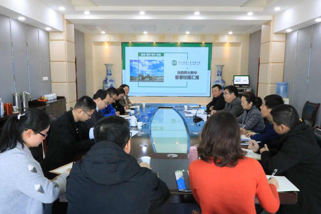 2019年11月14日西北大学袁新瑞教授、西安市现代教育技术中心宋主任、大明宫小学肖主任、雁塔区现代教育技术中心王教授等一行专家人来我校视察智慧校园建设工作。陕师大附中冯军校长、网络中心马立主任陪同参观了我校智慧校园建设项目,并带领附中智慧校园建设小组的成员给各位专家进行了工作汇报会议。