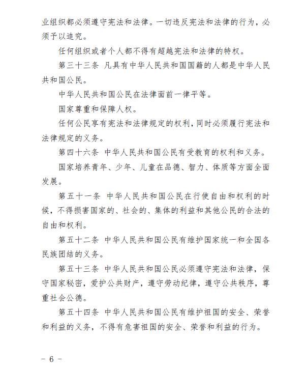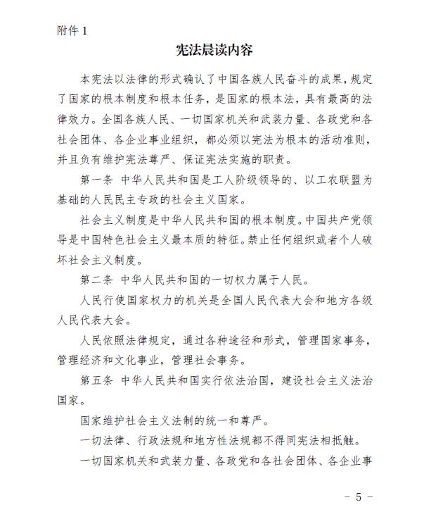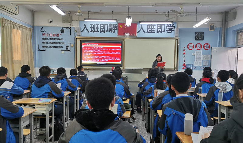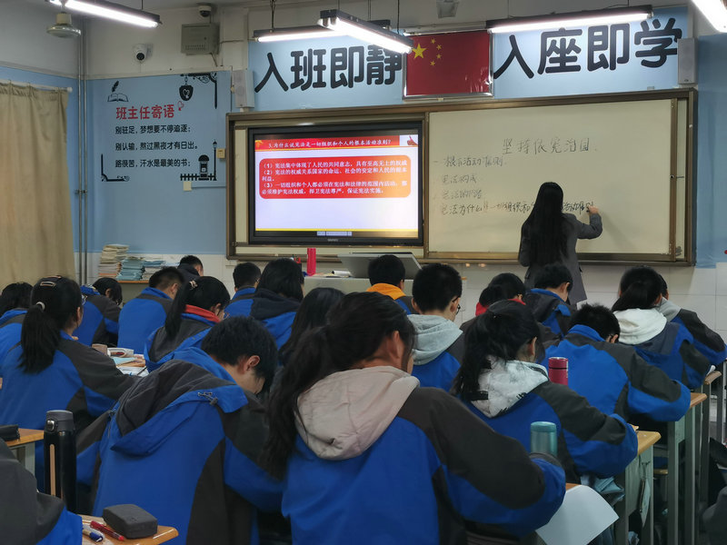 2019年12月4日上午,我校师生在科技楼报告厅通过普法网集体收看并同步参与了教育部组织的“宪法晨读”直播节目,大家跟读了由教育部领导领读的部分宪法条款,共同学习了相关宪法知识。下午,学校发挥课堂主渠道作用,在初三年级开展了宪法学习专题课,课堂上政治组王晓雨老师将宪法教育融入到教学中去,分别从宪法的内容、公民的基本权利与义务、公家机构、国旗、国歌、国徽几个方面为大家普及了宪法知识。随后,我校将继续开展以宪法教育为主题的国旗下演讲、主题班会等实践活动,并借助电子屏、黑板报、校园网、校园广播等载体,多渠道弘扬宪法精神,加强学生对宪法的了解与学习,形成宪法精神育人的教育环境。
