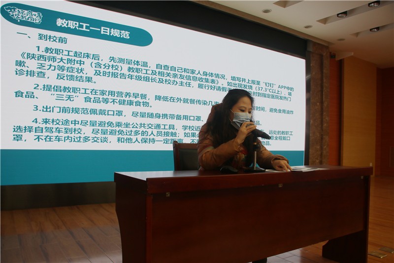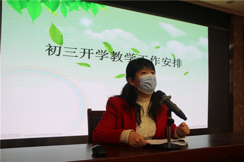 随后,政教处副主任鲍青青、教务处主任张元芳、总务处主任陈宏社、校办主任张辉依次就教职工一日规范、学生一日规范、错峰上下学、复习备考、补偿性教学、学生就餐、消毒、扫码入校、每日一报、考勤等事项做了全面、详细的培训和安排。