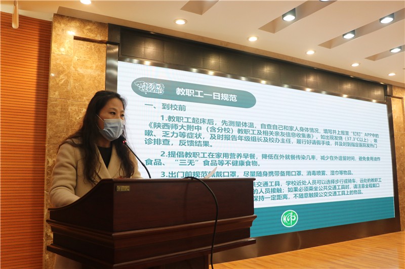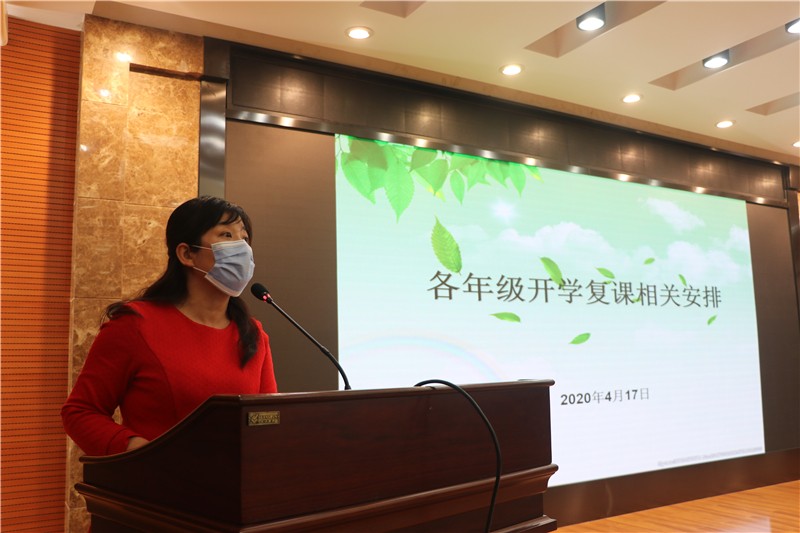会上,政教处副主任鲍青青、教务处主任张元芳、总务处主任陈宏社、校办副主任王建军依次就教师工作一日规范、学生学习生活一日流程、应急处置流程、学生体温监测、错时上课的时间和课程安排、线上线下教学衔接、备用教室安排、消毒防护物品的领取、校门口的健康安全排查、教师信息上报、健康监测等事项做了全面、详细的培训和安排。