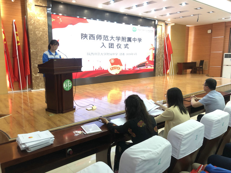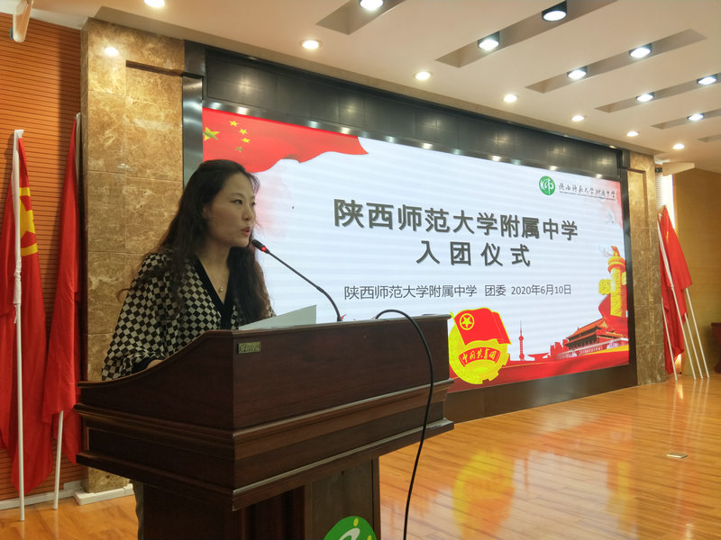 仪式在庄严的《光荣啊,中国共青团》中拉开了序幕,团委书记鲍青青介绍了此次新团员入团的过程(入团积极分子递交申请书,班级、年级推荐确定培训人员,寒晖团课线上系列培训,团知识考核等),并宣布了132名新团员名单,她向全体新团员表示祝贺,并提了具体要求:希望同学们要树立远大理想,确立正确的人生观、世界观、价值观;要珍惜青春,发愤学习,积极进取;希望大家不仅要在组织上,更要在思想上、行动上加入团组织,做青年学生的榜样。随后,教师代表为新团员佩戴了团徽,我校学生会副主席、2020年陕西省优秀共青团员王佳仪同学带领全体新团员面向团旗庄严宣誓,全体团员响亮的誓言在会场久久回荡。