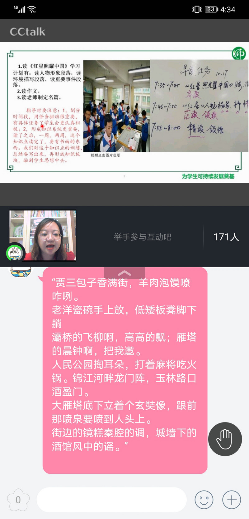 疫情发生以来,教育扶贫转战“云课堂”,信息化课堂来助力。自六月以来,对口支援临夏州的学科在线活动再发力。师大远程教育学院特聘李倩老师为本期在线培训直播课程中的中学语文项目组首席专家,策划为期两月的多次在线直播。6月13日下午3点,李倩老师题为“多彩教学课堂实践,中考语文精准指导”的讲座正式开始。讲座从一线教师的课堂策略中去探索如何提高学习语文积极性的问题,具体从六个方面探讨多彩语文课的教学策略,总结了在实践多彩语文课堂中教学活动。课例生动,并注意体现课程中的自主与创新。