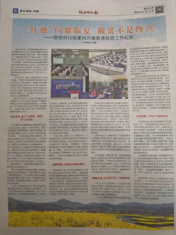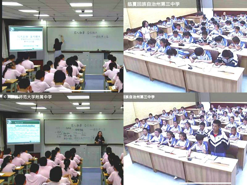 在陕西师大远程教育学院的组织安排下,在我校网络中心的大力支持下,从2019年开始,李倩老师多次对口支援临夏三中的“双师课堂”项目,在教学过程中利用网络设备对临夏三中开展远程互动。“双师课堂”指我校和临夏三中的同学都能够参与到课堂学习中,与老师交流互动,展示了技术在义务教育均衡发展方面发挥的巨大作用。两地师生见屏如面,同上一堂课;通过“东西部基础教育资源共建共享联盟”获得大量优质教学资源,与名校交流学习,与名师共同成长。在一次“双师课堂”作文课上,临夏三中的同学们惊叹道:“第一次感觉作文课这么有趣,就像闯关游戏,按老师的要求一步步做就可以完成一篇不错的作文。”“不可思议,我可以跟远隔千里的老师‘当面’互动!”。