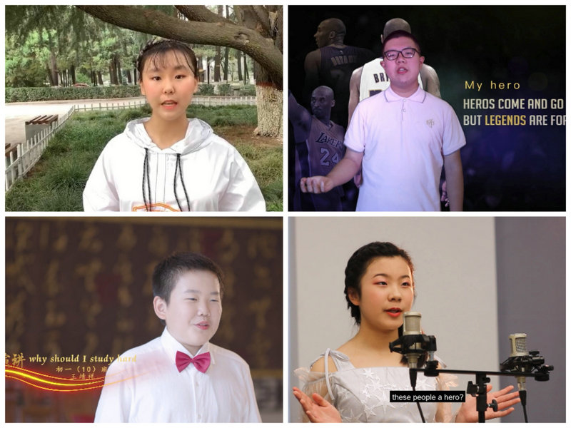 经过激烈角逐,初一9班焦畹同的作品《My hero》、初二2班高王紫的作品《United, we stand; divided, we fall.》、高一5班王婧涵的作品《Attitude decides everything》、高二1班王嘉琪的作品《The Advantages and disadvantages of online courses》、6班梁艺萱、7班景朝阳的作品《What can we learn in harm's way during the COVID-19?》荣获个人演讲环节第一名;初一8班萧麟懿、吴卓昕带来的歌曲《Counting stars》、初二6班梁海超、刘高逸飞的作品《Irony》、高一1班田雯嘉、王云莉、罗今一的作品《Head Above Water》、高二8班蔡雨楠的作品《Me and the Sky》荣获歌曲演唱第一名;初一7班李佳同等同学的作品《疯狂动物城》、初二9班陈瑗舒等同学的作品《精灵旅社》、高一7班牛孙家烨等同学的作品《傲慢与偏见》、高二5班郝昱开等同学的作品《The Lion King》荣获电影配音环节第一名。