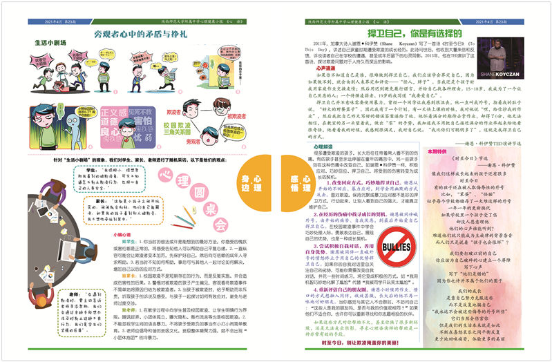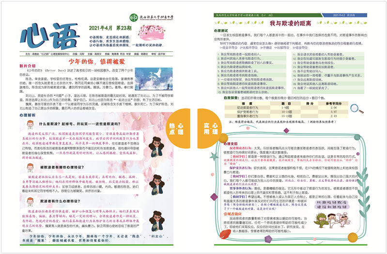 经过一个多月不断地研讨、打磨及修改,第23期《心语》小报针对“校园欺凌”进行了深入地心理解读,内容的专业性与通俗性相得益彰;同时版面设计的优化也提升了内容的可读性,改版后的《心语》小报即将和我校师生见面。