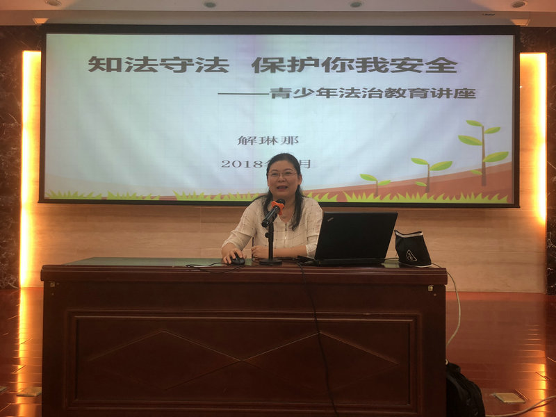 接下来,政治教研组谢琳娜老师为大家带来了一场主题为“知法守法 保护你我安全 ”的法制教育讲座。解老师结合了中学生实例生动的向全体新生介绍了作为一名中学生大家该如何尊法守法。她从交通安全、校园安全、人身安全三大方面对全体初一新生做了详细的要求,结合具体问题,提出了具体的解决方式,使同学们更加深刻地认识到在生活中养成良好行为习惯的重要性。整场讲座深入浅出、全面细致地介绍了在特殊情况下如何进行自我保护等方面的知识,给学生们上了一堂富有教育意义的法制教育课。