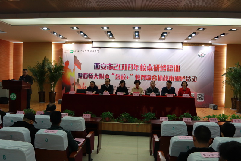 11月15日上午8:30,西安市2018年校本研修培训第十四期暨陕西师大附中“名校+”教育联合体校本研修活动在我校科技楼报告厅开幕。西安市教科所副所长贾玲,雁塔区党委委员 教育督导室主任饶小华,雁塔区进修学校校长王养民,我校校长冯军、党委书记陈勇刚、副校长高丽文等领导出席了开幕式。开幕式由西安市教科所培训部主任周洪涛主持。