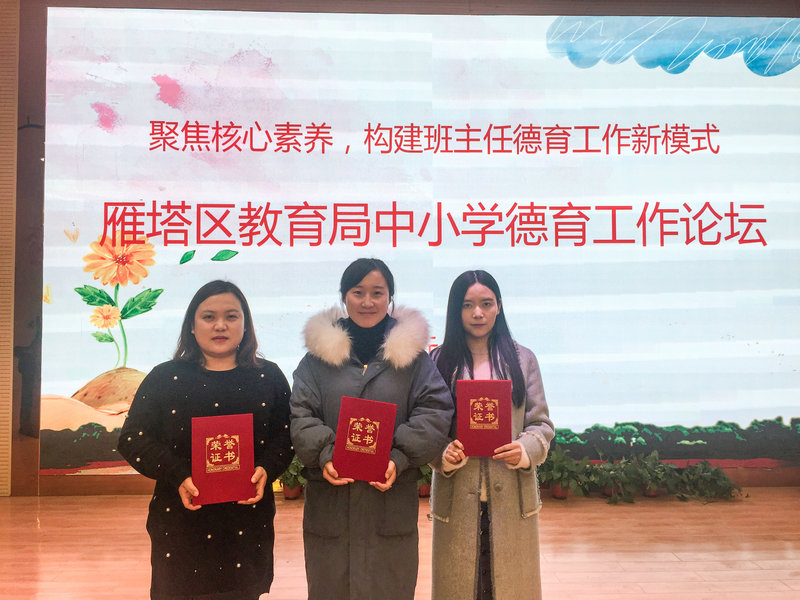 为了更好地贯彻党的十九大精神,学习理解习近平的教育思想,落实立德树人根本任务,2018年11月-12月,雁塔区教育局在全区中小学开展了“优秀实践案例”评选活动,我校推荐李莎、何丽燕、张欢和姚岚老师参加了此评选活动。