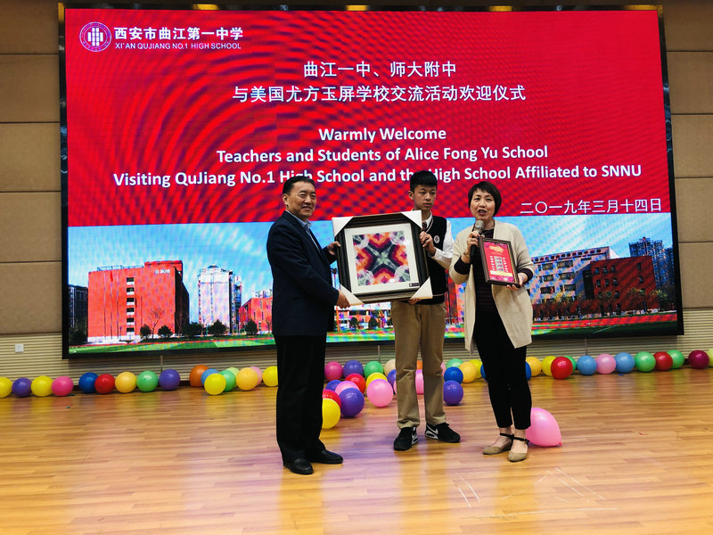 3月18日晚,中美三所学校的师生、家长欢聚一堂,在西安阳光丽都大剧院举行了2019年中美文化交流活动欢送仪式,张帆副校长致欢送词,他表示此次尤方玉屏学校师生的来访对于三所学校之间的交流、合作具有纪念意义,希望将来能够进行更深入的交流访问;尤方玉屏学校副校长也表达了对陕西师大附中、曲江一中两所学校为他们提供了此次访问机会的感谢,并希望两所学校将来有机会莅临她们学校进行交流、访问;我校学生代表李奕霖、黄子茜向来访的师生表达了几日来与自己搭档的生活故事,并表示会珍惜这段美好的时光、非常期待暑期的回访活动;尤方玉屏学校的学生代表也向两所学校和接待的家庭表示了感谢;最后我校张帆副校长及政教处鲍青青副主任为尤方玉屏学校来访的学生及我校和曲江一中接待学生颁发结业证书及优秀接待证书。