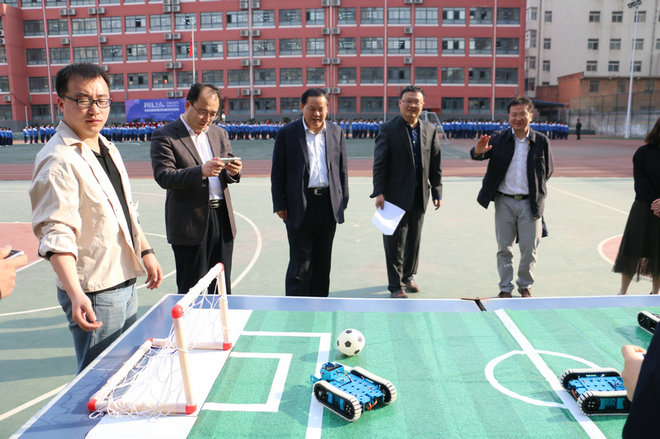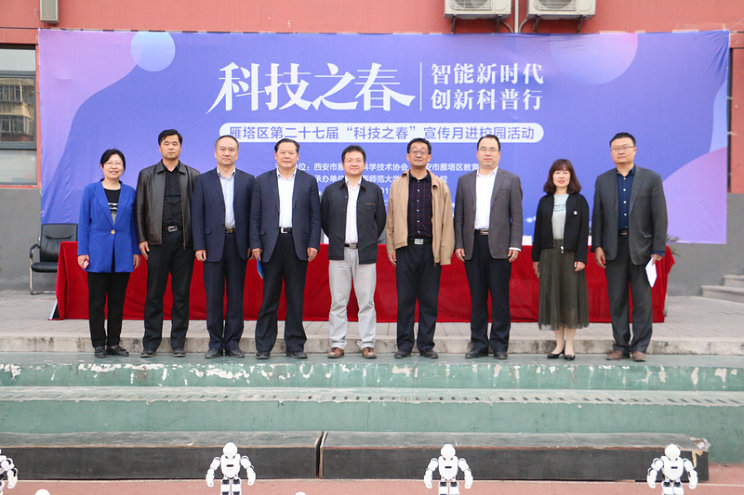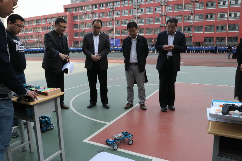 由雁塔区科工局与雁塔区教育局主办,附中分校承办的雁塔区第二十七届“科技之春”进校园活动按照预定计划顺利开展。雁塔区科工局副局长张阳,调研员谭戈,科普办主任孙燕妮等一行8人,雁塔教育局杨勇副局长、教育局基教科科长郭朝锦,附中分校边团结校长、附中分校执行校长冯军,师大附中分校刘晓晴副校长,碑林教师进修学校数学与创客教研员刘晓挺老师,以及部分科技教育公司代表参加了本次活动。