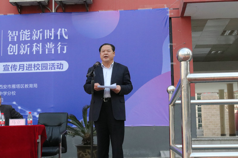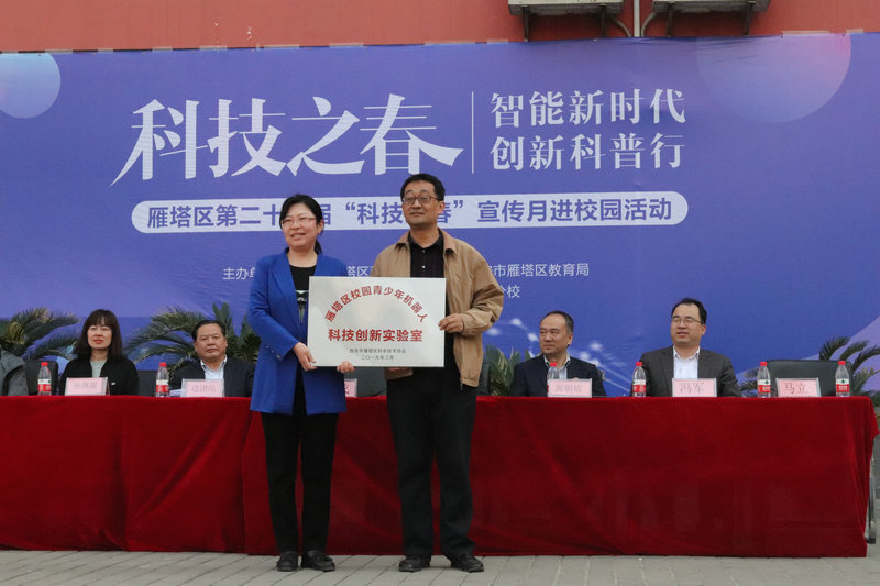 活动由网络中心马立主任主持,边团结校长致欢迎词,雁塔区科工局副局长张阳讲话、雁塔区科工局正处级调研员谭戈为附中分校雁塔区校园青少年机器人科技创新实验室进行授牌,教育局基教科郭朝锦科长宣布活动开始。
