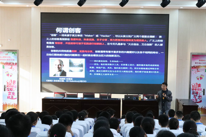 本次活动邀请了碑林教师进修学校刘晓挺老师在学校三层报告厅为高一年级学生开展青少年科技创新讲座。同时安排初一年级学生在操场上不同的展区体验智能机器人,创客,人工智能,3D打印,VR虚拟现实等当前主流的智能科技,并且每个展区都有专业人员给同学讲解相关知识。