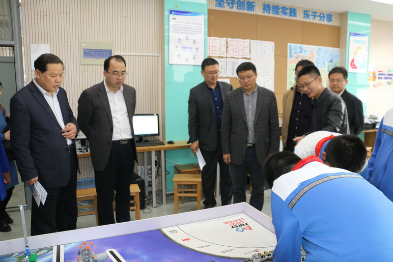 所有领导参观了分校青少年科技创新实验室,李云海老师带领分校初一年级参与工程挑战赛的三位同学向所有领导展示了附中分校科技活动的开展情况,受到了所有领导的一致好评。