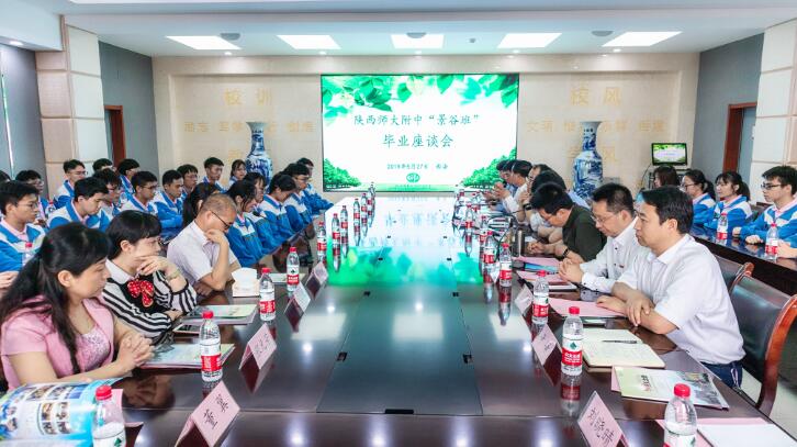 2019年5月27日上午,我校“景谷班”毕业座谈会在崇是楼五层会议室举行,座谈会由陕西师范大学副校长任晓伟主持,陕西师范大学校长游旭群、科技处处长吴晓军、副处长张卫兵、校办副主任辛峰,我校校长冯军、党委书记陈勇刚、我校原任校长、党委书记边团结、副校长刘晓晴、沙瑞龙、张帆、高丽文,政教处主任权小红、教务处主任张元芳、教研室主任董翼、高三年级组长符洁、景谷班教师代表韩谈判、杜定能以及景谷班全体学生参加了此次座谈会。