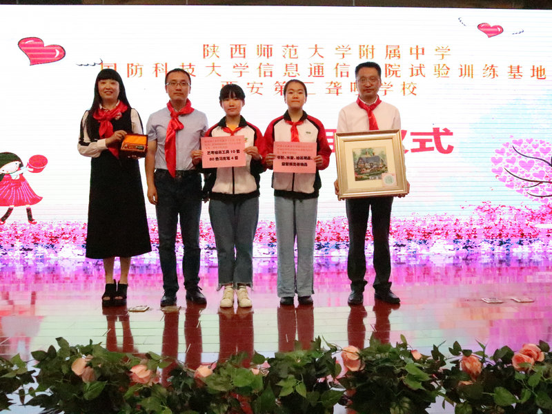 接着,党委书记陈勇刚及政教处主任权小红以及初一年级组长王芳老师为我校前期举办的初2021届 “平语近人,学习习总书记用典”主题手抄报及数学学科活动中获奖的学生颁奖,同时为我校初2021届的22位优秀同学发放了我校军民共建单位——国防科技大学信息通信学院试验训练基地提供的爱心奖助学金。陈勇刚书记为西安第二聋哑学校师生代表发放了由国防科技大学信息通信学院试验训练基地以及我校爱心团队捐助的爱心物品,随后,主持人邀请全场观众观看视频,大家共同回顾了我校爱心团队六年以来的义卖捐助活动,西安第二聋哑学校团委书记杨亮致感谢词。